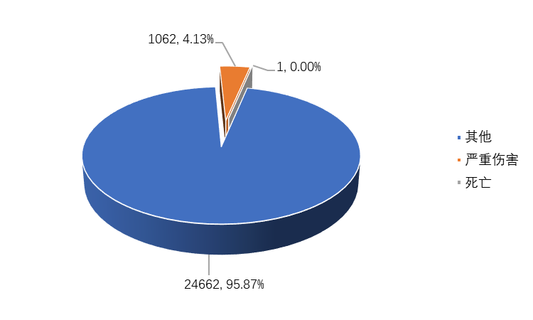2022年,全省上报的医疗器械不良事件报告中,伤害程度为严重伤害的报告1062份,占比4.13%;死亡的报告1份,占比小于0.01%;其他报告24662份,占比95.87%(图2-2)。与2021年相比,严重伤害及死亡报告数量下降了2.66%,占比仅为4.13%。