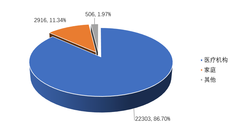 产品使用场所为医疗机构的报告22303份,占86.70%;使用场所为家庭的报告2916份,占11.34%;使用场所为其他的报告506份,占1.97%(图2-4)。医疗机构是医疗器械不良事件发生及报告的主要场所。