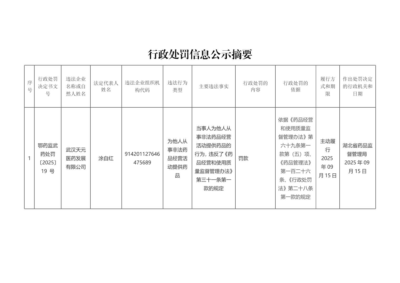 行政处罚信息公示摘要(湖北天元医药发展有限公司)